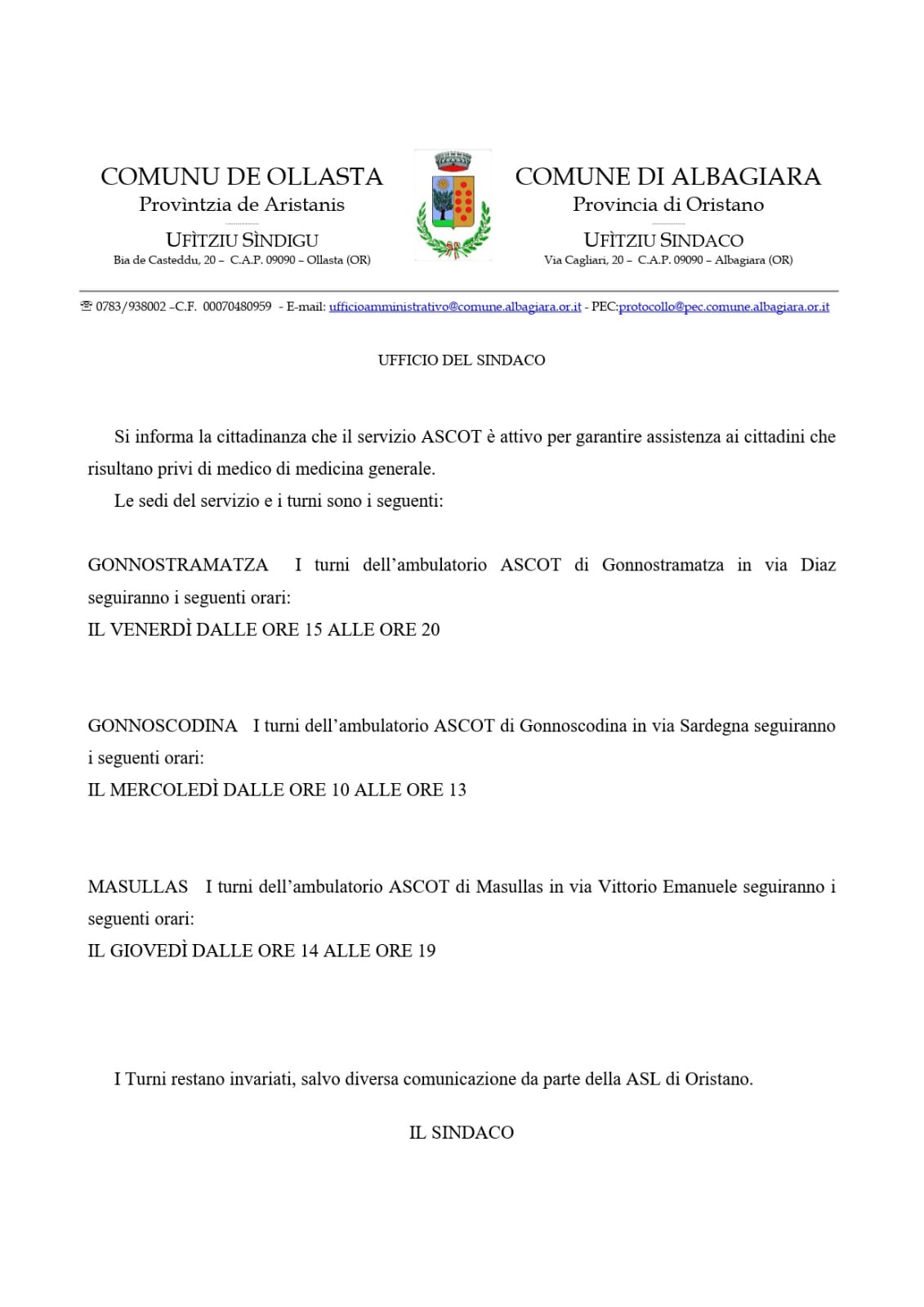 Servizio ASCoT presso ambulatorio di Masullas, Gonnostramatza e Gonnoscodina